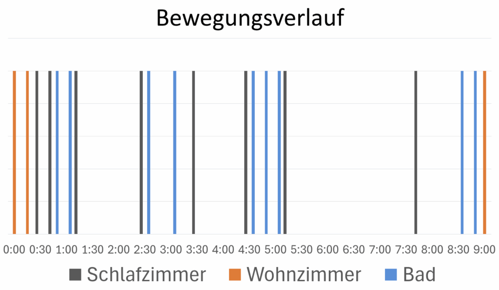 In einer Wohnung werden drei Sensoren aufgestellt. Normalerweise zeigt sich ein typisches Bewegungsmuster mit einer Pause in der Nacht.
